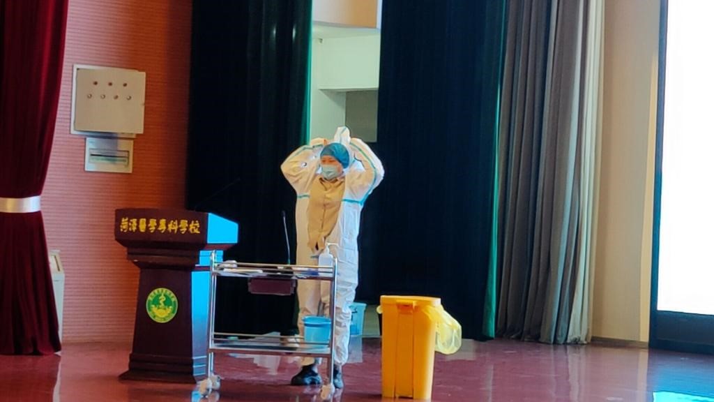 培训邀请石晓峰,老年保健与服务教研室主任宋艳苹,预防医学实训中心负责人侯锋伟,就疫情防控期间常态化消毒消杀、个人防护等防疫知识详细讲解。侯锋伟强调消毒消杀的必要性,对几种常见消毒剂的特点进行分析,并对消杀工作中消毒液的配制和日常消毒方法向同学们做详细讲解。宋艳苹就如何进行个人防护展开介绍,重点介绍了口罩、防护帽的正确佩戴方法、手部消毒方法和体温测量方法,对同学们日常防疫中存在的误区进行讲解,与在场同学一起练习七步洗手法。石晓峰详细介绍了防护服的穿脱方法,细致入微地讲解了每个注意事项,亲身示范演示,确保每位志愿者学会并当场掌握。志愿们纷纷表示十分珍惜此次学习机会,认真聆听老师所讲知识,积极配合练习。将所学内容及时传达给班级内的每一名同学,以点带面,以练促用,努力为疫情防控工作做好充足准备。