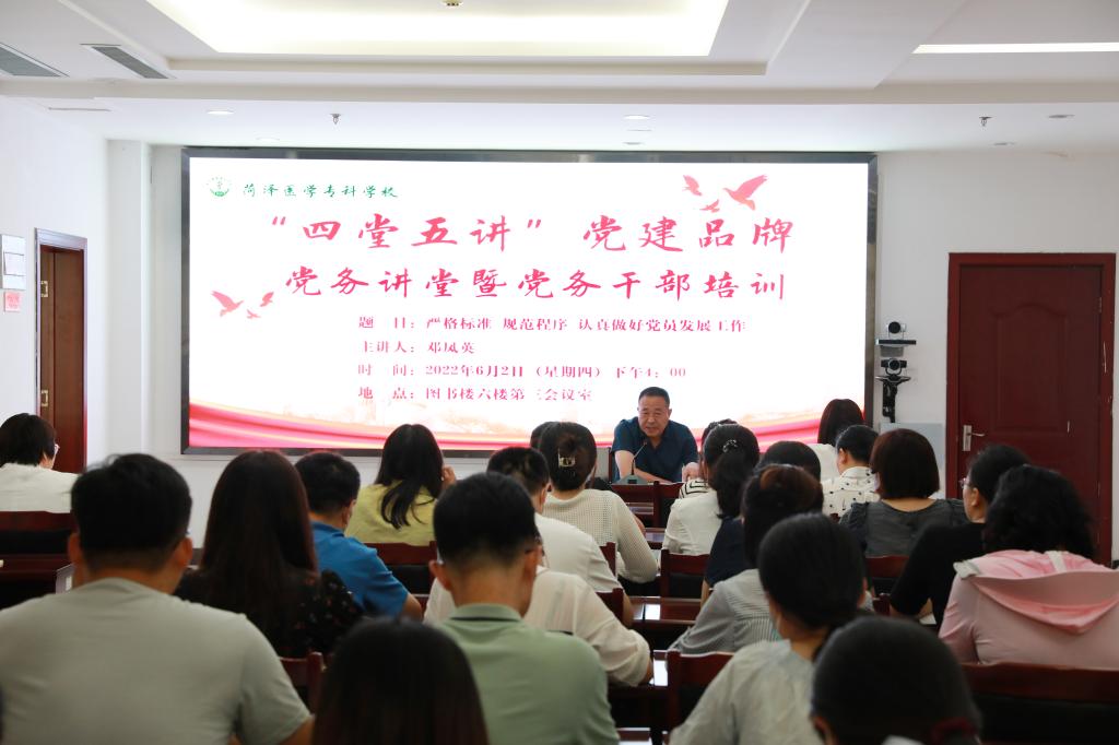 为进一步强化发展党员工作的标准意识、程序意识,提升我校发展党员工作规范化水平,6月2日下午,我校在图书楼第三会议室举办“四堂五讲”党建品牌党务讲堂暨党务干部培训。本次培训由校党委委员、副校长张传宝同志主持,邀请组织部副部长邓凤英同志作“严格标准 规范程序 认真做好党员发展工作”专题培训。学校各党支部负责党员发展的党务干部参加本次讲座。
