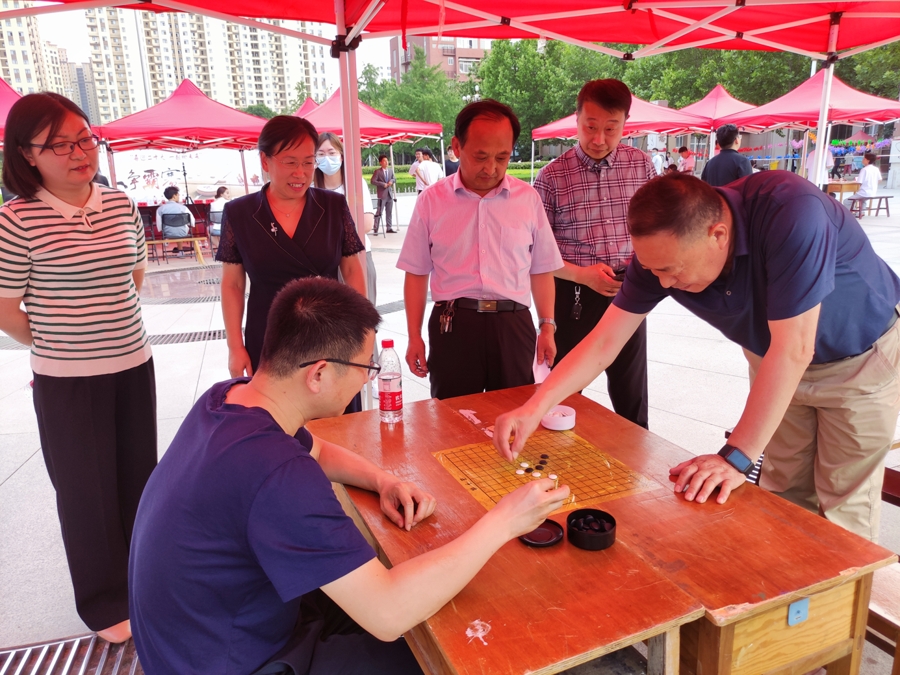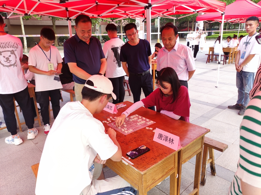 为弘扬体育文化精神,培养我校大学生竞技意识,丰富校园文化生活,以积极饱满的状态迎接党的二十大的胜利召开,6月2日下午,由校团委主办、药学与检验系团总支承办的首届“喜迎二十大一起向未来”棋王争霸赛在石泉广场正式拉开帷幕,校党委委员、副校长张传宝,学生工作处处长孙战,团委书记于淼及各系部党总支书记出席比赛现场。