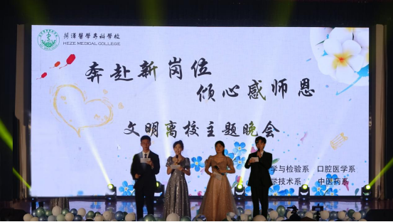 为给2022届菏医实习生的在校生活留下一个美好的回忆,开启崭新的实习生活,并表达全体实习生对老师由衷的感谢,6月6日晚,由药学与检验系、口腔医学系、医学技术系、中医药系四系联合举办的“奔赴新岗位 倾心感师恩”文明离校主题晚会在学术报告厅举行。我校学工处处长孙战、团委书记于淼、各系书记、主任、副书记及全体辅导员、学业导师等受邀出席了本次晚会。四系师生欢聚一堂,共同欣赏了这次精彩纷呈的演出。