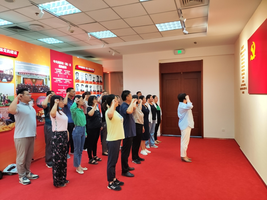 在馆内工作人员的引导和讲解下,大家参观学习了“红色传承逐梦之路”展厅。展览精选500余副照片,真实记录了菏泽党组织带领人民英勇奋斗、攻坚克难的光辉历程,反映了百年来菏泽人民励精图治、艰苦创业取得的辉煌成就。通过展览,党员同志们深刻认识到红色政权来之不易、当下生活来之不易,也更深刻理解了中国共产党为什么能、马克思主义为什么行、中国特色社会主义为什么好。参观最后,全体党员同志重温入党誓词,在党旗前进行庄严宣誓。