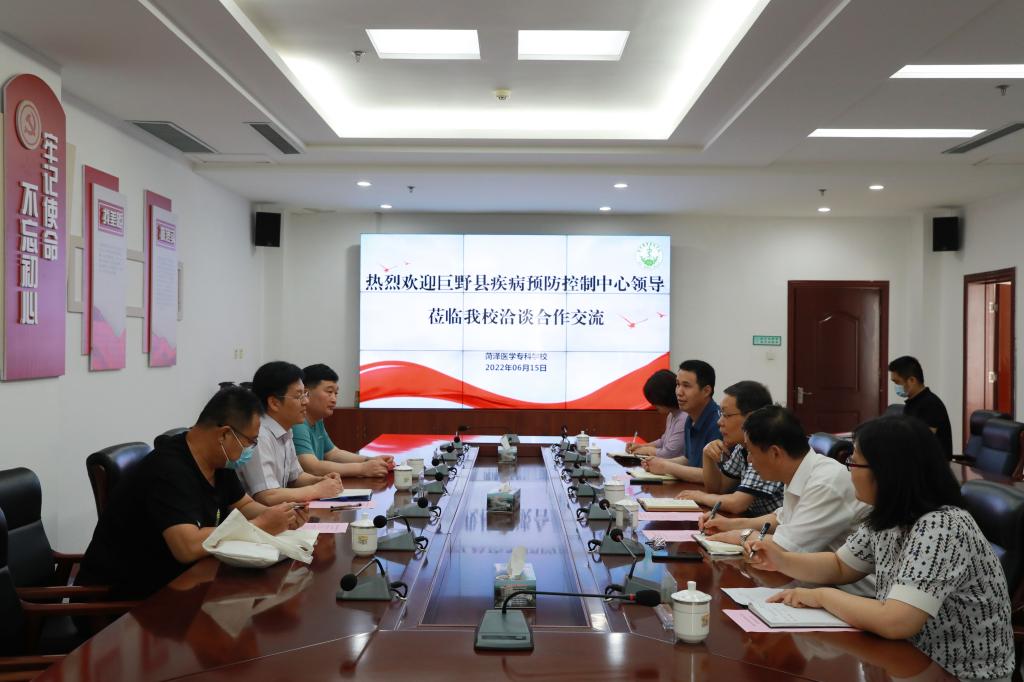 6月15日上午,巨野县疾病预防控制中心主任伍恩标一行三人来我校进行交流,商谈合作事宜,座谈会在图书楼第一会议室举行。党委副书记、校长顾润国,党委委员、副校长蒋继国,健康管理系党政负责人参加座谈会。校企合作与培训就业处处长王学贺主持座谈会。
