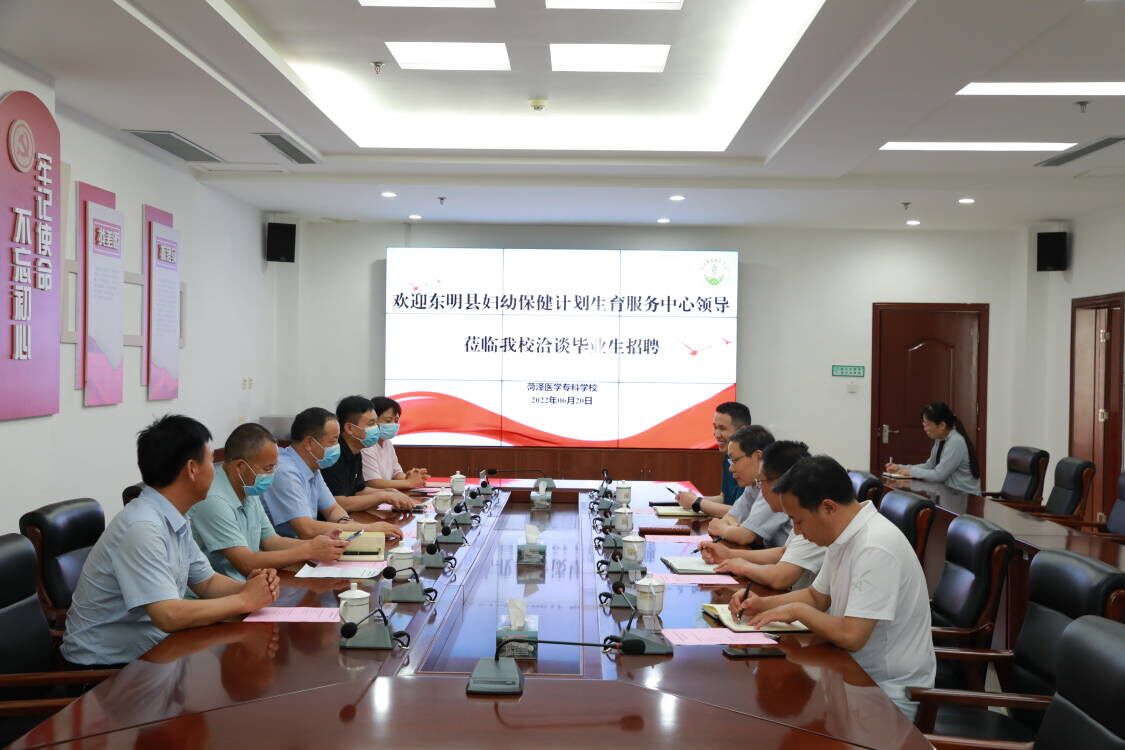 6月20日下午,东明县妇幼保健计划生育服务中心(东明县妇幼保健院)院长黄君一行5人到我校洽谈毕业生招聘事宜。党委副书记、校长顾润国,党委委员、副校长齐云飞,校企合作与培训就业处及相关系负责人参加了座谈会。