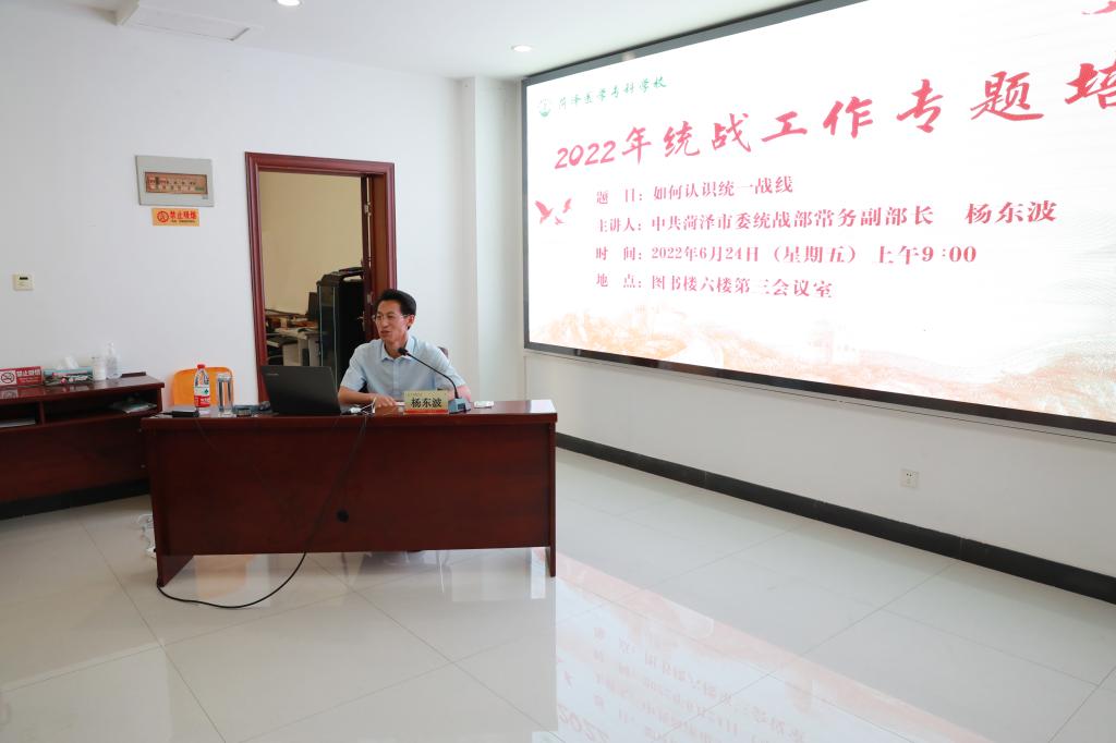 6月24日上午,我校在图书楼六楼第三会议室举行2022年统战工作专题培训。本次培训邀请中共菏泽市委统战部常务副部长杨东波同志作“如何认识统一战线”专题讲座,党委书记于洲声同志主持,党委委员、副校长蒋继国、齐云飞,各二级部门负责同志、各党总支、支部书记和统战委员参加了本次培训。