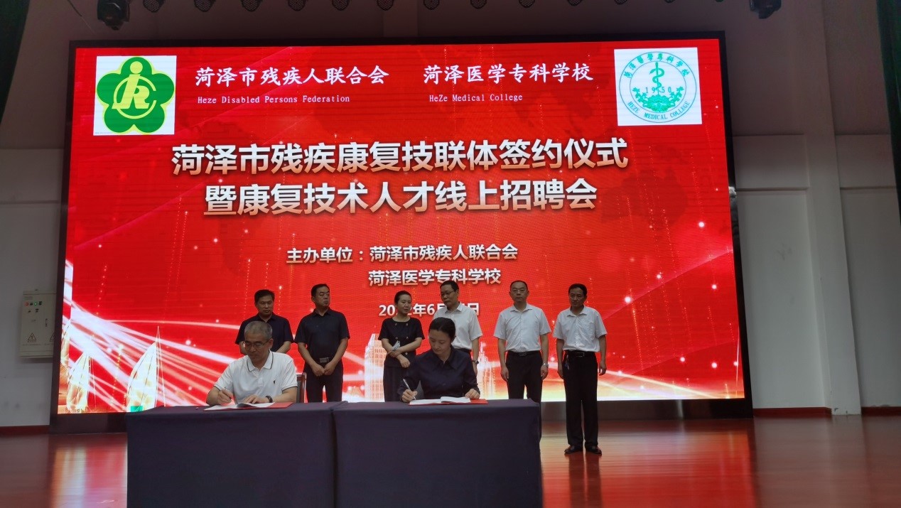 为进一步促进我校康复专业毕业生更充分、更高质量就业,为菏泽市残疾康复定点机构康复专业技术人才引进搭建平台,6月24日,我校联合菏泽市残疾人联合会在菏泽医专附属医院共同举办菏泽市残疾康复技联体签约仪式暨康复技术人才线上招聘会。菏泽市委副书记李春英出席,菏泽医专党委副书记、校长顾润国致辞。签约仪式由菏泽医专党委委员、副校长、附院党委书记刘心臣主持,菏泽市残联党组书记、理事长周广东,菏泽医专附属医院领导、医学技术系党政负责人参加了此次会议。