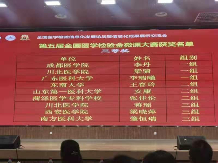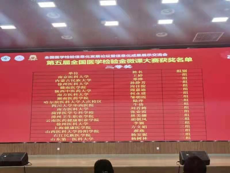 在第五届全国医学检验信息化教学能力大赛金微课组比赛中,张业霞老师、周阳老师、王学芳老师、付乐晨老师、张佳伦老师的《健康的法宝之抗体的功能》荣获二等奖;张佳伦老师、周阳老师、张业霞老师的《B细胞与Th细胞的相互作用》荣获三等奖;王学芳老师、张业霞老师、周阳老师、张佳伦老师的《有的放矢精准治疗的先决药物体外抗菌实验之K-B法》荣获三等奖;周阳老师、王学芳老师、张业霞老师、张佳伦老师、付乐晨老师的《都是鱼生惹的祸—肝吸虫》荣获三等奖。