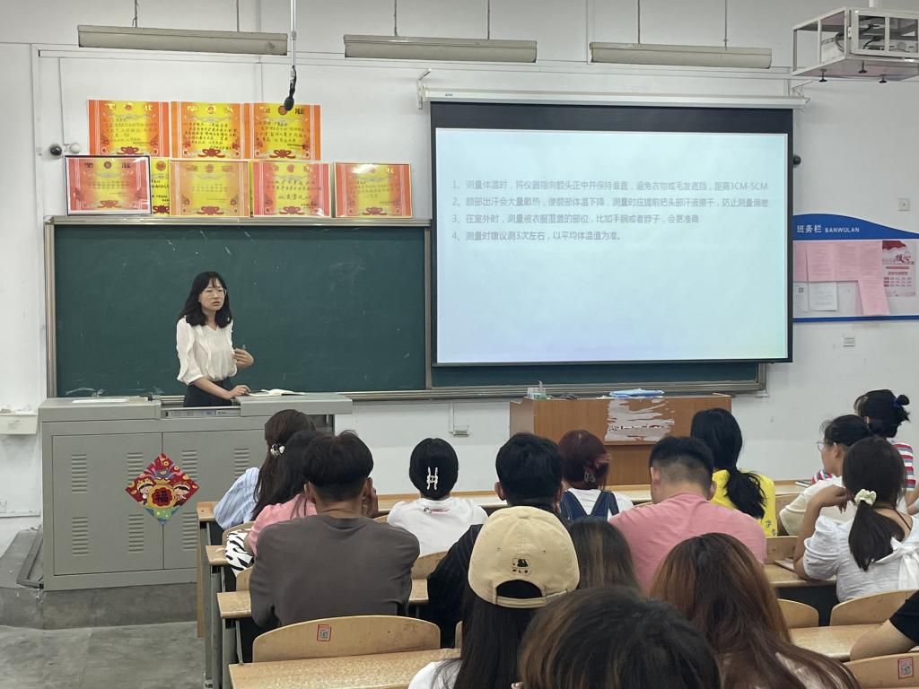 张彬斌老师向志愿者们详细解读了迎新方案,从迎新时间和准备要求、分组情况、工作内容、纪律要求等方面为志愿者进行了全方位培训。李雪莹老师结合当前疫情防控形势,向志愿者讲解如何正确穿脱防护服、正确使用体温枪,并进行现场演示。