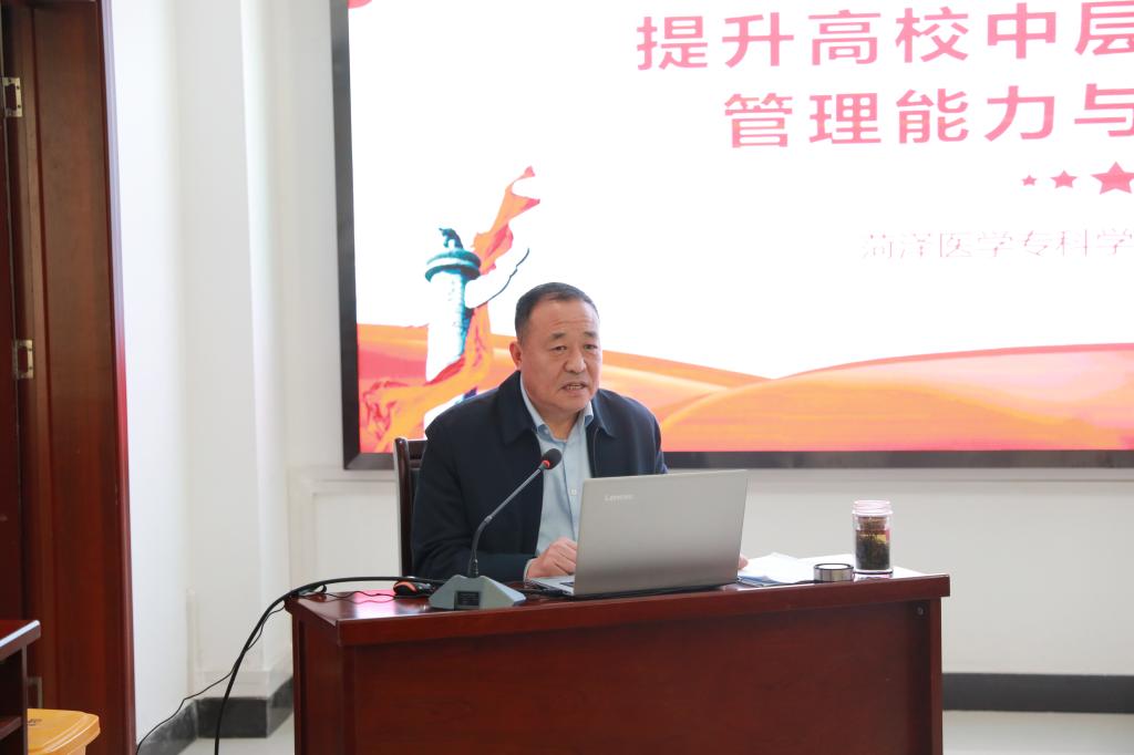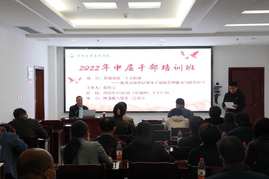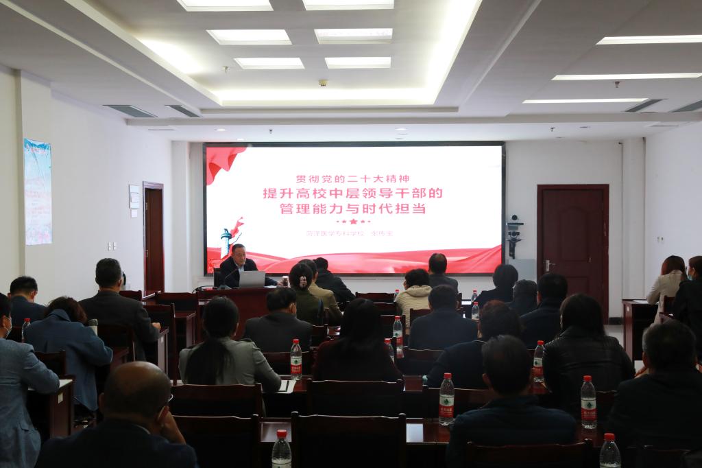 为深入贯彻党的二十大精神,适应中国式现代化教育的要求,进一步提升我校干部综合素质,11月3日下午,我校在第三会议室举行2022年中层干部培训班第三讲。本次培训邀请学校党委委员、副校长张传宝同志作“贯彻党的二十大精神 提升高校中层领导干部的管理能力与时代担当”专题讲座,党校副校长、人事处处长谢明夫同志主持本次培训,各二级部门中层干部参加培训。