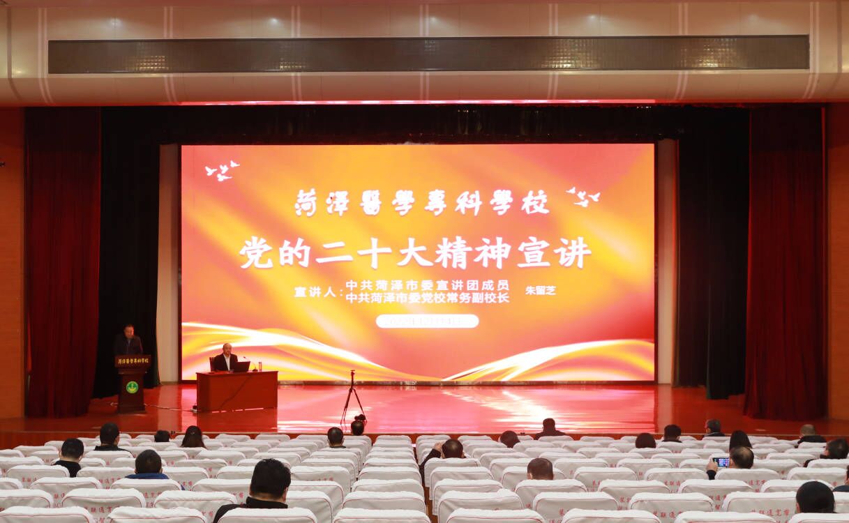 12月14日上午,根据市委统一部署,菏泽市学习贯彻党的二十大精神宣讲团成员、市委党校常务副校长朱留芝同志到我校进行宣讲,学校教职工100余人听取报告。校党委委员、副校长张传宝主持本次报告会。
