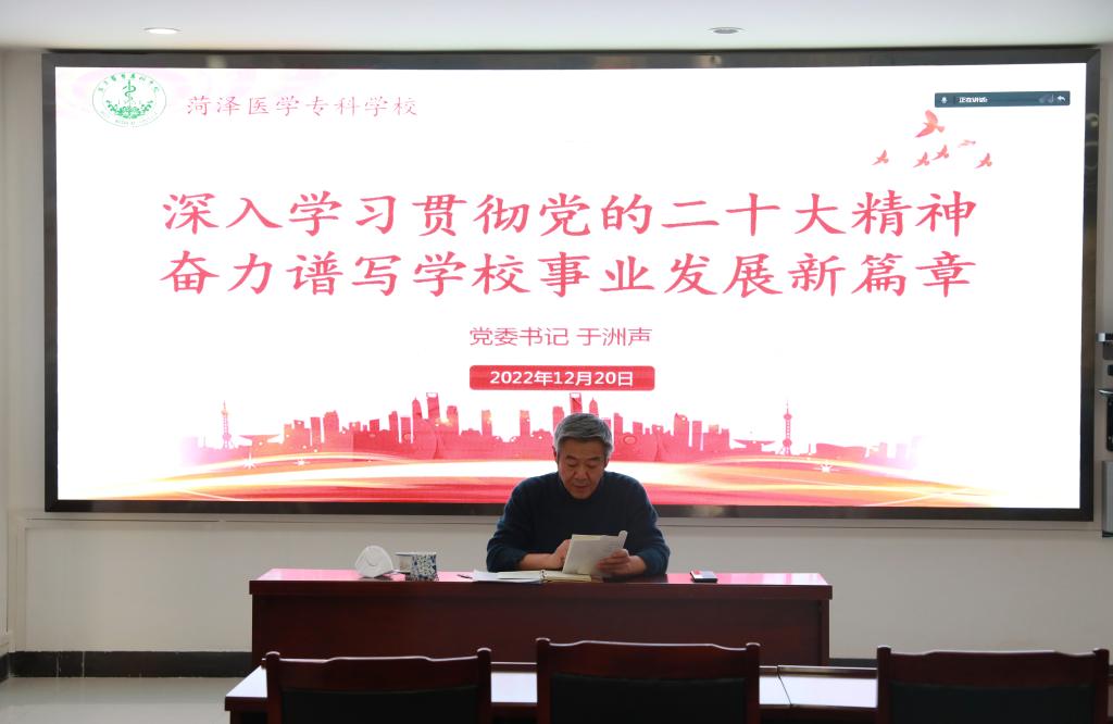 12月20日下午,党委书记于洲声为学校中层正副职及以上领导干部作学习贯彻二十大精神专题报告。受疫情影响,本次党课采用线上线下结合的方式进行,副校长张传宝、齐云飞及部分中层领导干部在学校第三会议室现场参加,其他同志以视频会议的形式收听收看了本次报告。