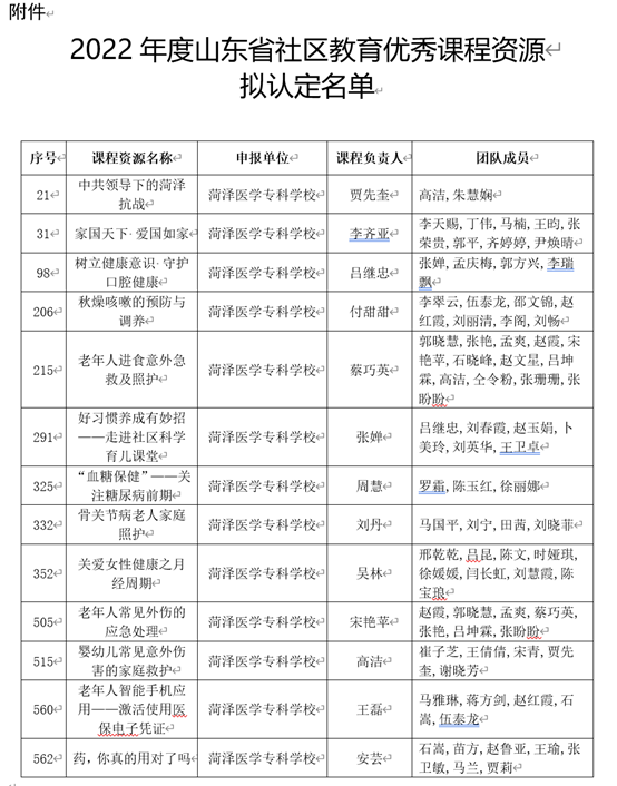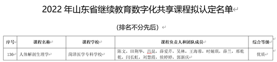近日,山东省教育厅发布了《2022年度山东省社区教育优秀课程资源遴选结果公示》和《2022年山东省继续教育数字化共享课程遴选结果公示》,我校《中共领导下的菏泽抗战》等13门课程资源成功入选省社区教育优秀课程资源,《人体解剖生理学》课程成功入选省继续教育数字化优质课程。