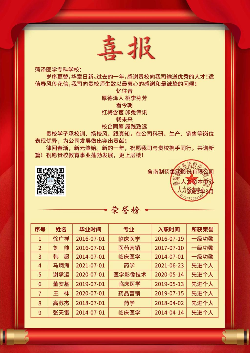 近日,鲁南制药集团股份有限公司发来喜报,我校徐广祥等9名毕业生2022年度工作出色、成绩突出,获得鲁南制药集团股份有限公司荣誉表彰。其中,徐广祥等3人获“一级功勋”荣誉称号,马炳海等6人获“先进个人”荣誉称号。这也是我校连续第5年收到鲁南制药集团股份有限公司喜报。多年来,我校毕业生就业广受用人单位欢迎,用人单位对我校毕业生工作能力和学校人才培养质量给予充分认可和高度评价,毕业生就业和发展前景十分广阔。