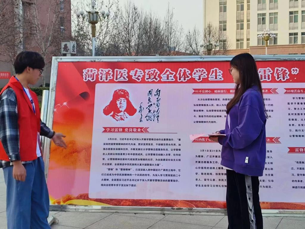 仪式上,我校学生工作处、团委组织通过大型展板、LED大屏、条幅宣传、展示“弘扬雷锋精神,争做志愿先锋” —菏泽医专学雷锋倡议书及宣传标语,展示雷锋事迹、生平。志愿者为同学发放“倡议书”。同学们纷纷驻足,自发在“学雷锋,树新风,争当校园文明先锋!”的条幅上郑重签下自己的名字。