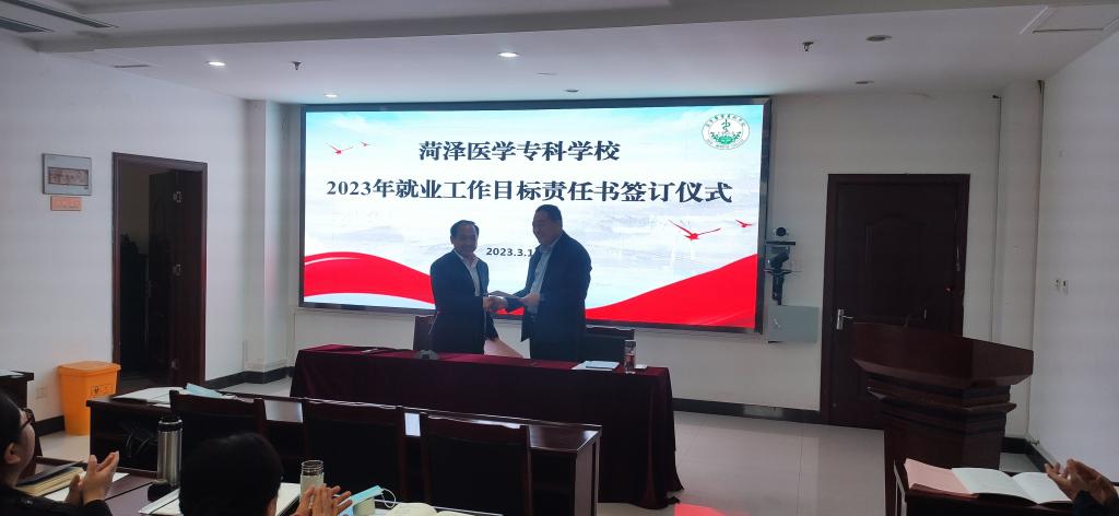 张传宝与各系党总支书记签署2023年就业工作目标责任书,并对2023年毕业生就业工作提出三点要求。一是认清形势,抢抓机遇,充分认识2023届毕业生就业工作的重要性、紧迫性;二是明确任务,狠抓落实,完善就业机制,加强组织领导,深入开展访企拓岗,加强职业生涯规划和就业指导,强化资源协同,精准就业帮扶,持续优化分类指导服务;三是剖析问题,直面对待,全员同心促就业,积极引导大学生树立正确就业观,营造良好的就业氛围,减少“慢就业、不就业”现象。