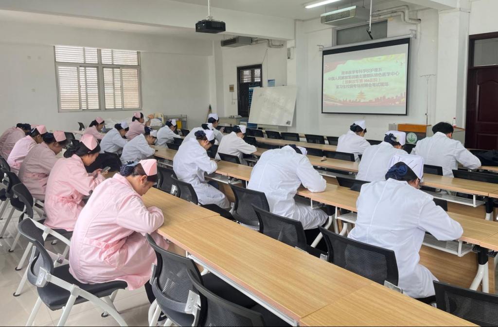 选拔过程分为笔试和面试两个环节,面试期间,我校学生扎实的专业基础和大方得体的言行举止获得主考官的一致好评。专业知识笔试环节,同学们冷静思考、从容作答。本次选拔活动共有23名护理专业学生参加,选拨合格的学生将于今年7月份步入实习岗位。