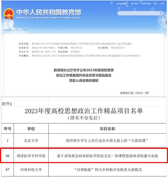近日,教育部办公厅公布了2023年度高校思想政治工作质量提升综合改革与精品建设项目入选名单,我校申报的“基于系统观念的高职医学院校五位一体课程思政体系构建与实践”项目,成功入选高校思想政治工作精品项目。