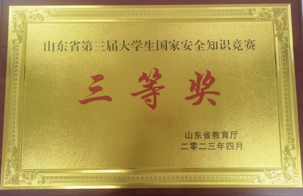 4月15日,山东省教育厅主办的“中国电信杯”山东省第三届大学生国家安全知识竞赛在济南圆满落幕,我校学生代表队凭借扎实的理论功底和良好的舞台表现荣获团体三等奖。