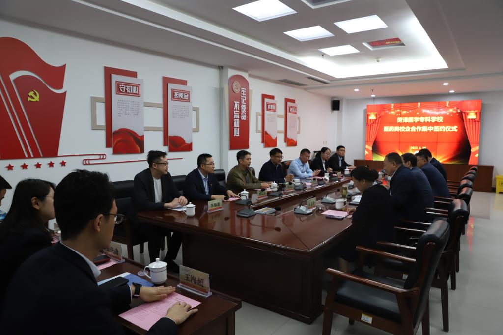 与会人员观看了学校宣传片“菏医这十年”。青岛同方药业连锁有限公司、瑞阳制药股份有限公司、齐鲁制药有限公司、甘李药业山东有限公司和山东九州通医药集团股份有限公司分别介绍了各自企业的基本情况,表达了与学校加强合作、实现共赢的强烈愿望。最后,学校与参会的5家企业分别签订了校企合作签约仪式,并就以后的合作方向进行了深入的交流和讨论,为实现互惠共赢奠定了良好的基础。(药学与检验系 史申楠/文 田文革/审核)
