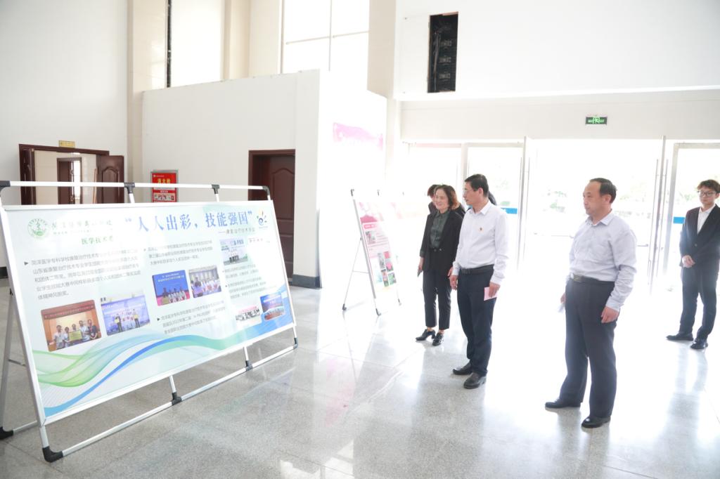 在激昂奋进的音乐声中,教师与学生代表走向舞台中央,一起按下按钮,共同开启2023年职业教育活动周。开幕式后,蒋继国和医学技术系师生步入大礼堂大厅观看我系职业教育成果展。
