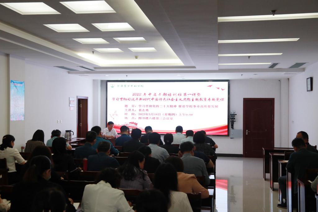 为深入开展学习贯彻习近平新时代中国特色社会主义思想主题教育,贯彻落实党的二十大精神,5月18日上午,我校在图书楼六楼第三会议室举行党校2023年开学典礼和中层干部培训班第一讲暨学习贯彻习近平新时代中国特色社会主义思想主题教育专题党课。党委书记袁志勇在开学典礼上致辞并为中层干部讲授专题党课,省卫生健康委主题教育联络组参加,学校党委班子成员、各二级部门党政正副职参加。开学典礼和专题党课由党委副书记、校长顾润国主持。