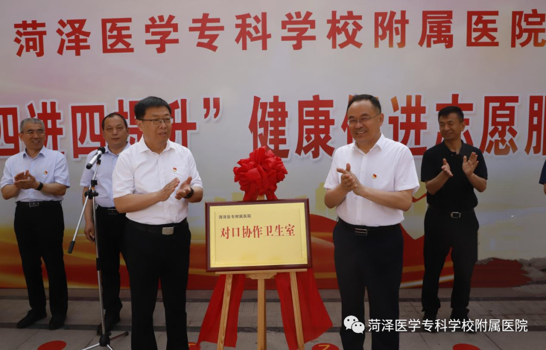 启动仪式上,袁志勇要求,附属医院要依托专业优势,常态化开展“四送四进四提升”健康促进行动,切实把家庭医生服务、卫生应急急救知识、疾病防控知识、中医药特色疗法送到群众身边,让群众享受到便利和实惠,提升群众的健康服务获得感和幸福感,切实将主题教育活动走深走实。孔鲁民在致辞中对附属医院近年来开展的工作给予了高度的评价,并希望附院乘“四送四进四提升”活动的东风,常态化开展各项工作,为鲁西新区卫生健康事业发展作出新的更大的贡献。袁志勇书记、练建军书记为我校附属医院对口协作卫生室进行了揭牌。达成协作关系后,我校附属医院将以社区卫生室为支点,以优质的医疗资源为社区居民提供更为便捷的高质量的家庭医生服务。