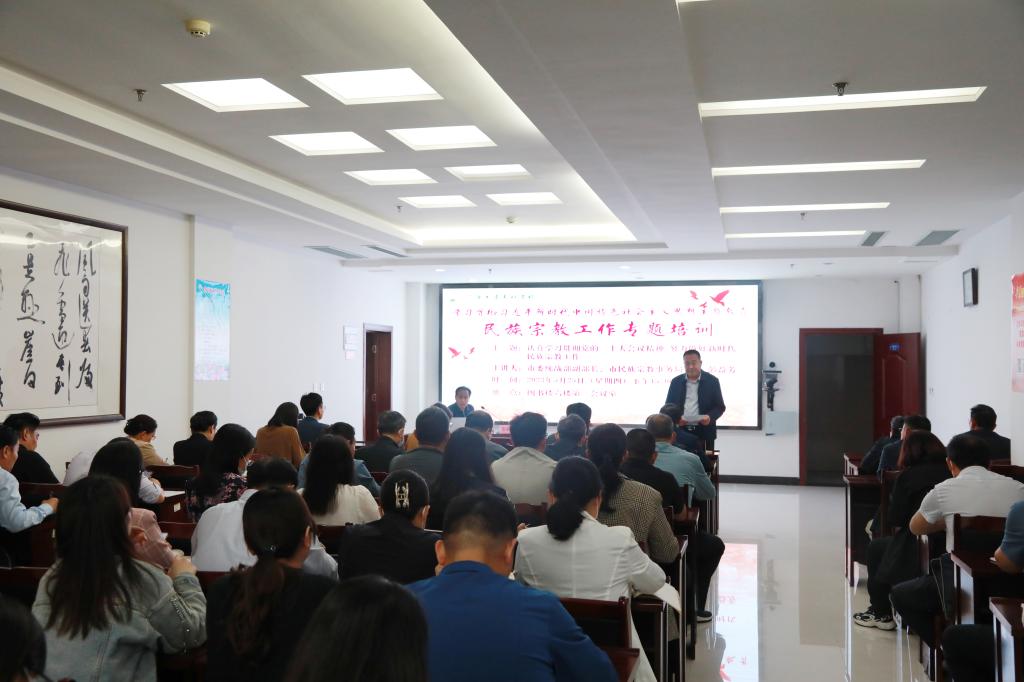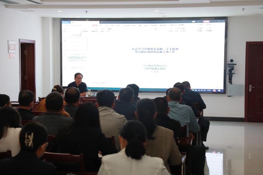 为扎实推进主题教育走深走实,学习贯彻党的二十大精神,5月25日下午,我校在图书楼六楼第三会议室举行学习贯彻习近平新时代中国特色社会主义思想主题教育民族宗教工作专题培训。本次培训邀请市委统战部副部长、市民族宗教事务局局长彭益芳同志作“认真学习贯彻党的二十大会议精神、努力做好新时代民族宗教工作”专题讲座,党委委员、副校长张传宝同志主持,在校领导班子成员,各二级部门党政正副职、党支部书记和组织部(统战部)、学生工作处、安全管理处工作人员参加了本次培训。
