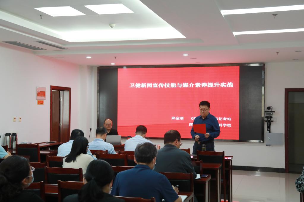 为扎实推动习近平新时代中国特色社会主义思想主题教育走深走实,6月2日,我校邀请国家卫生健康委《健康报》山东记者站站长、《山东卫生健康》杂志执行主编郝金刚作《卫健宣传技能与媒介素养提升实战》专题讲座。省卫生健康委主题教育联络组,学校党委班子成员,各二级部门党政负责人,宣传部全体人员及全校网评员、信息员参加讲座。学校党委书记、主题教育领导小组组长袁志勇主持。