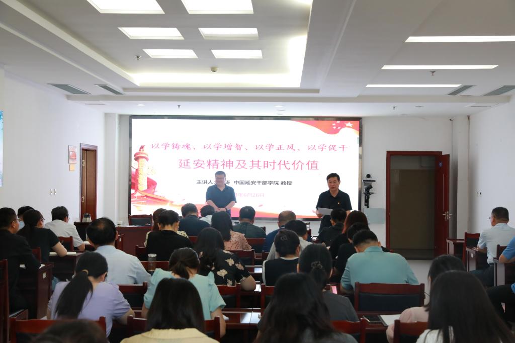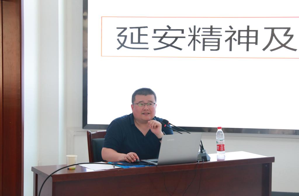 在全党上下学习贯彻党的二十大精神、开展学习贯彻习近平新时代中国特色社会主义思想主题教育之际,为推进主题教育走深走实,6月26日上午,我校邀请中国延安干部学院王涛教授在图书楼第三会议室做《延安精神及其时代价值》辅导报告。学校中层正副职、党总支正副书记、支部正副书记、全体专职辅导员、思政部全体人员参加此次报告会。党委副书记蒋继国主持报告会,
