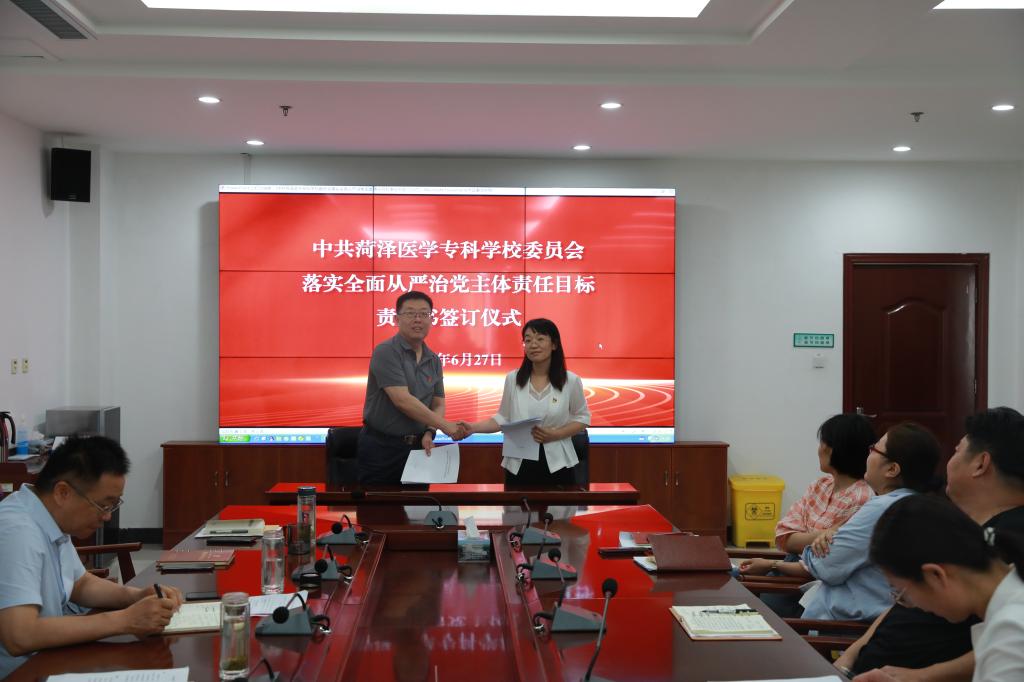为全面贯彻党的二十大精神,压紧压实全面从严治党工作责任,形成上下贯通、层层负责、逐级落实的责任体系,凝聚抓党风廉政建设和反腐败工作的强大合力。6月27日,在图书楼第一会议室,学校党委书记袁志勇与各党总支(党委、直属党支部)书记签订落实全面从严治党主体责任目标责任书。