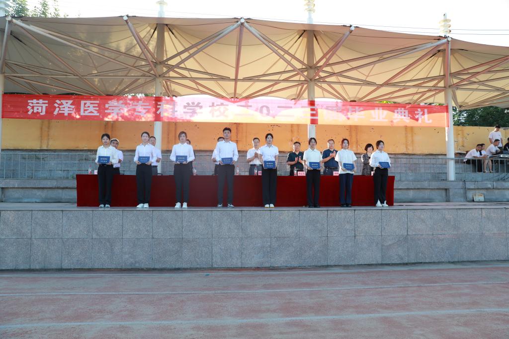 毕业典礼在庄严的国歌声中拉开序幕。校党委副书记蒋继国同志宣读《菏泽医学专科学校关于颁发2023届毕业生学历证书的决定》,副校长齐云飞同志宣读《菏泽医专2023届优秀毕业生和省级优秀毕业生的决定》。随后,学校领导为毕业生代表颁发了毕业证书。