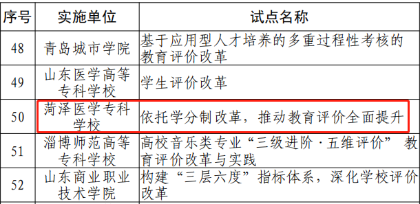 学校历来高度重视教育评价改革工作,以中共中央、国务院《深化新时代教育评价改革总体方案》及山东省教育评价改革相关政策文件为引领,以我校正在推行的学分制改革为抓手,不断丰富教育评价的层次化、类型化、多元化,不断完善立德树人机制体制,持续推动教育评价的全面提升。本次入选山东省教育评价改革试点,是我校继《高等职业教育临床医学专业认证路径研究及指标体系开发》、《健全教授上课制度,科学核对教师工作量》两项改革入选山东省教育评价改革项目库之后的又一突破,也体现了省级教育行政部门对我校教育评价改革工作的肯定。下一步,学校将按照省教育厅要求,进一步明确目标方向和改革责任,持续完善项目内容,不断落实任务措施,聚力关键环节,突破重点难点,切实推动教育评价改革落实落地,助力学校办学高质量发展。 (教务处 韩冰/文 韦岩/审核)