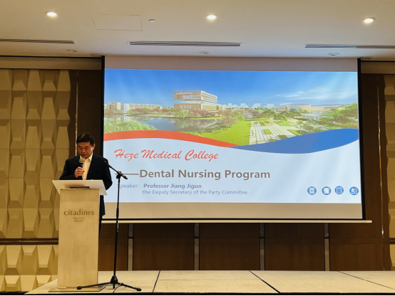 蒋继国代表学校做主题汇报,介绍了学校办学历史及口腔护理专业建设发展情况,并与英国、菲律宾、蒙古国参会院校代表深入探讨各国口腔护理教育理念、人才培养、行业需求与发展前景以及开展国际间口腔护理人才共享及科研合作的可行性,共商实现路径和方式方法,交流借鉴伙伴国经验,并就该领域的前沿理论和实际应用展开讨论。