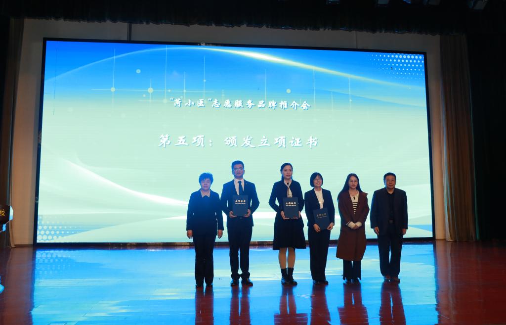 现场,爱牙“童”行—助力儿童口腔健康、“老有所学,目明心清”、青少年脊柱侧弯“万人筛查”三项特色志愿服务项目的指导教师就项目背景、宗旨以及意义做了详细介绍。同时,青年志愿者代表吕子迎就参与志愿服务项目活动也发表了深刻感受,让现场观众深入体会到志愿服务项目的内容与意义。与会领导认真听取了“菏小医”志愿服务品牌的有关情况,共同为三位指导教师颁发立项证书。