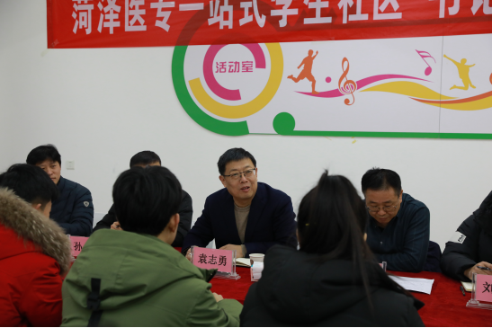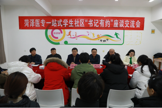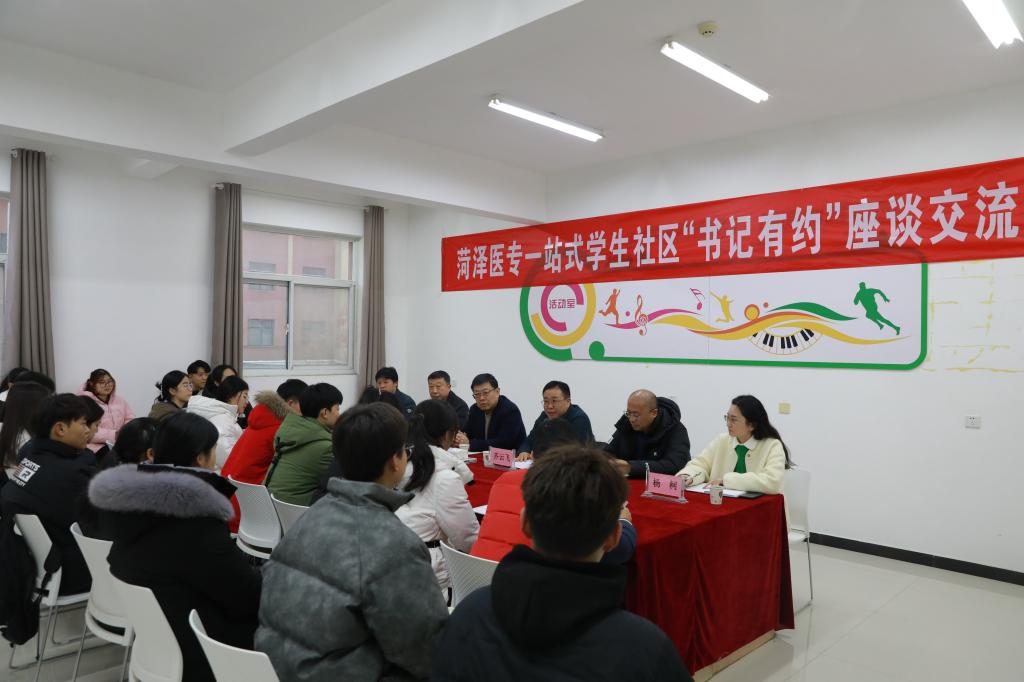 为深化我校“一站式”学生社区综合管理模式建设,贯彻落实菏泽医学专科学校领导干部深入基层联系班级、宿舍工作制度,建立与学生常态化互动交流机制,及时解决涉及学生思想、学习、生活、发展等实际问题。12月14日下午,我校在“一站式”学生社区9号学生公寓护理系辅导员工作站,召开“书记有约”学生代表座谈会。校党委书记袁志勇、副校长齐云飞、学生工作处处长孙战、护理系党总支书记刘明哲、包联班级辅导员刘建海、杨珂及20名学生代表参加座谈。