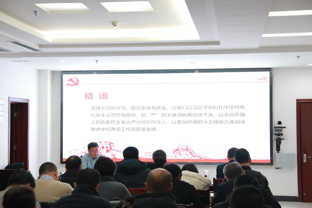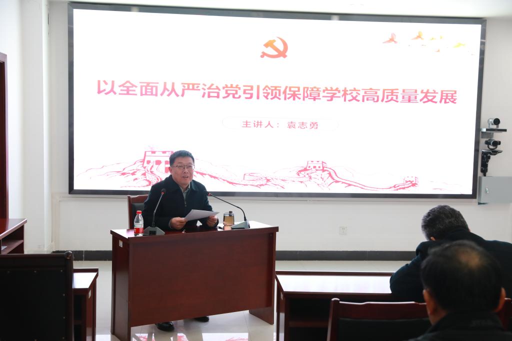 袁志勇以“以全面从严治党引领保障学校高质量发展”为题,围绕充分认识新时代全面从严治党的重大意义、深刻领会新时代全面从严治党战略部署、坚决落实新时代全面从严治党实践要求三个方面,从历史视角梳理了我们党自觉发扬自我革命精神、深化全面从严治党的历程,深入阐释了新时代推进全面从严治党的重大意义,详细讲述了全面从严抓党的思想建设、全面从严抓党的政治建设、全面从严抓党的组织建设、全面从严抓党的纪律建设、全面从严抓党的制度建设、全面从严抓党的作风建设管党治党“六个从严”目标任务,从现实维度分析了学校的形势、明确了实践任务,紧密结合学校工作实际,提出了落实新时代全面从严治党实践要求六个方面的具体措施,强调要把党的自我革命战略部署和全面从严治党战略方针贯彻落实到学校工作全过程各方面,承压负重、担当作为,奋力谱写我校内涵式高质量发展的新篇章。