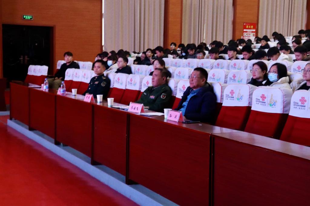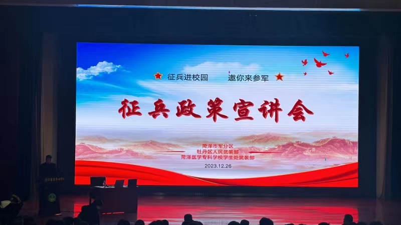 为深入贯彻习近平强军思想,进一步落实国家征兵工作相关要求,引导有志青年学生参军报国。12月26日下午,我校在学术厅举办“2023年国防教育暨征兵政策宣讲会”。牡丹区区委常委、人武装部部长侯强,校党委委员、副校长齐云飞,牡丹区政工科科长刘福鹏,菏泽市征兵形象大使朱红军班长,21级全体辅导员及600余名学生代表参加宣讲会。会议由学生工作处处长、武装部部长孙战主持。