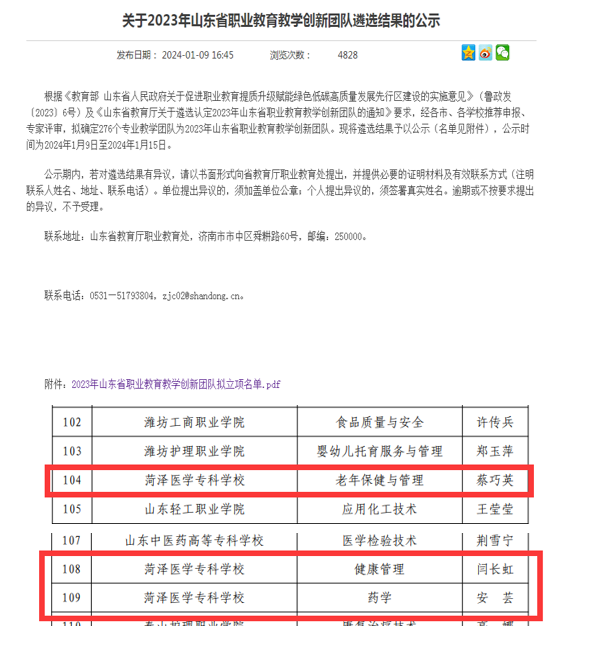近日,山东省教育厅网站发布了《关于2023年山东省职业教育教学创新团队遴选结果的公示》,我校老年保健与管理专业团队、健康管理专业团队、药学专业团队成功入选2023年山东省职业教育教学创新团队。