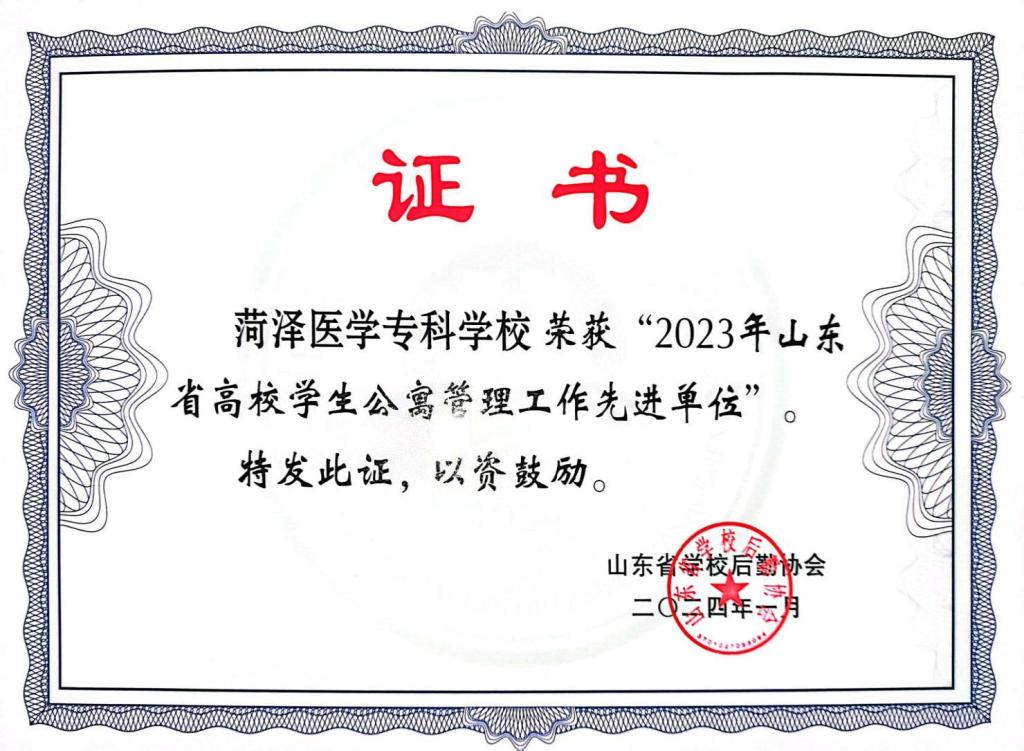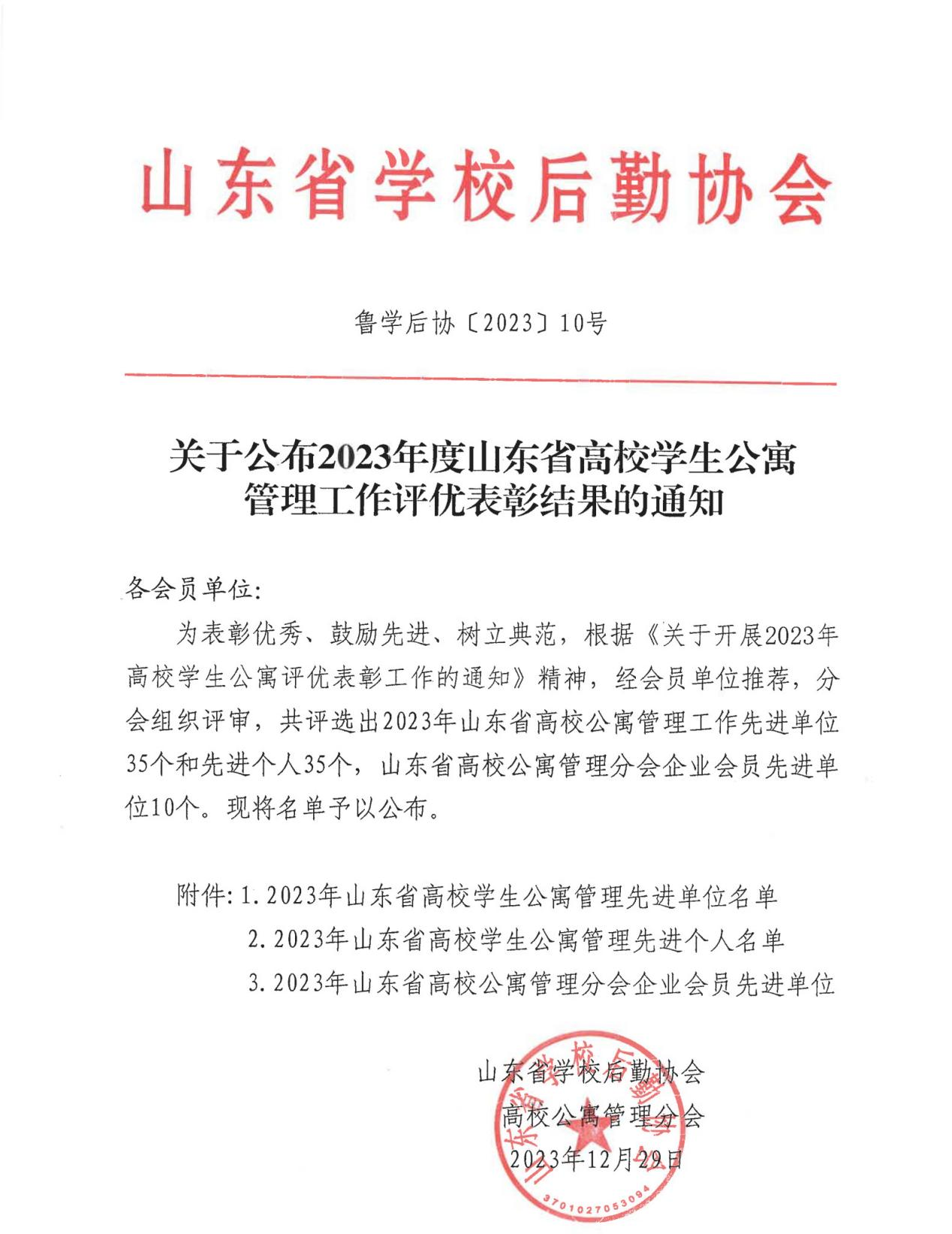 近日,由山东省学校后勤协会组织的“2023年山东省高校学生公寓管理工作先进单位”评选结果公布,全省35所高校获此殊荣,我校榜上有名。