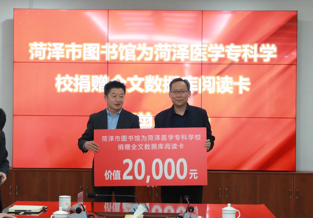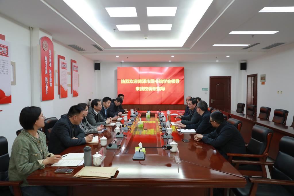 张朝永对我校近年来的快速发展和取得的成就给予了高度评价,菏泽市图书馆学会理事长董晖代表市图书馆向我校捐赠2万元的全文数据库以示支持。随后双方就资源建设、阅读推广、馆员能力提升等方面进行了深入交流。