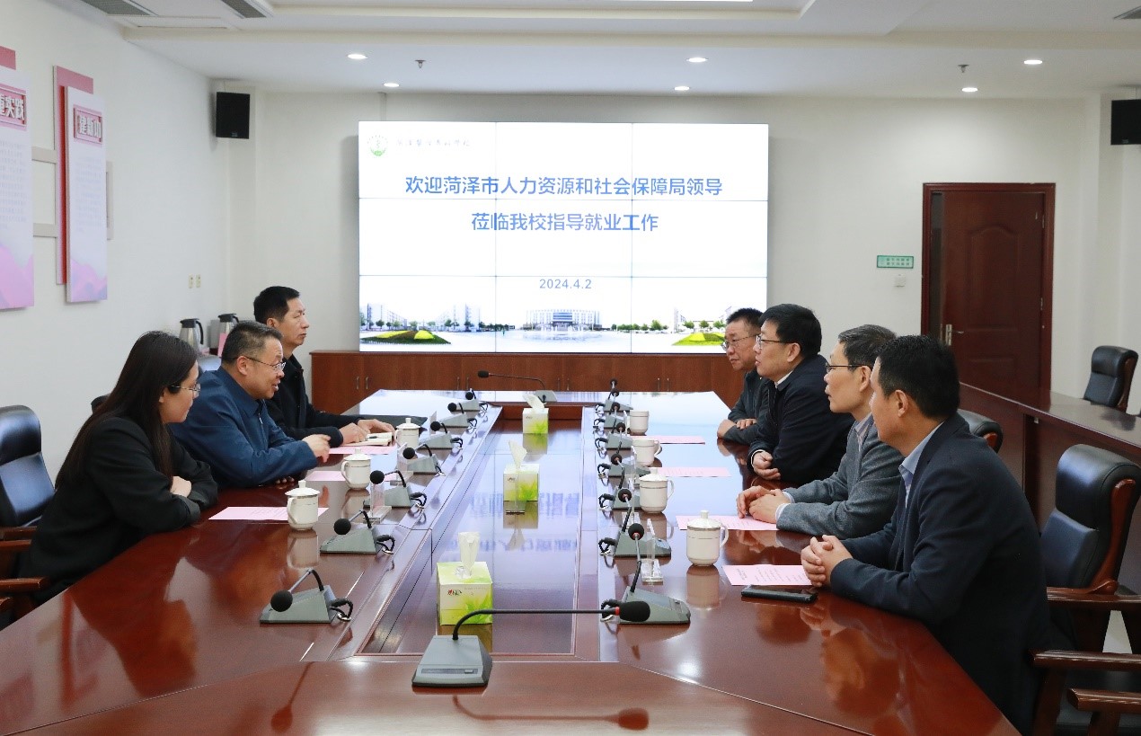 菏泽市人力资源和社会保障局党组成员、副局长田孝金,菏泽市公共就业和人才服务中心副主任丁君,市公共就业和人才服务中心毕业生服务科科长邵永璐与我校党委书记袁志勇,党委副书记、校长顾润国,党委委员、副校长齐云飞,校企合作与培训就业处处长王学贺在学校第一会议室就高校毕业生就业服务工作进行座谈,袁志勇表示,近年来,我校坚定落实党中央、国务院“稳就业”“保就业”决策部署和上级部门工作要求,高度重视就业工作,精准打造“一二三四”就业工作体系,拓宽就业渠道,优化就业服务,开展精准帮扶,提升工作“温度”,使我校就业工作取得明显成效。