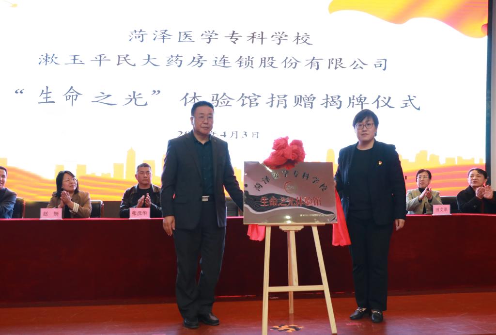 校党委委员齐云飞和漱玉平民大药房连锁股份有限公司人资中心总监谢永超为“生命之光体验馆”揭牌。随后,进行漱玉商学院签约,菏泽医学专科学校漱玉商学院正式成立。