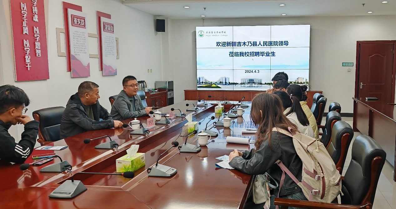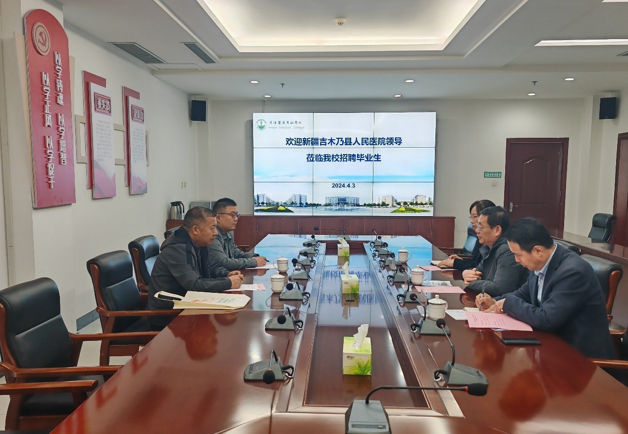 4月3日,新疆吉木乃县人民医院副院长颉倍峰等一行两人来我校专场招聘毕业生。党委副书记蒋继国,校企合作与培训就业处处长王学贺等相关工作人员参加座谈会。