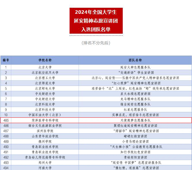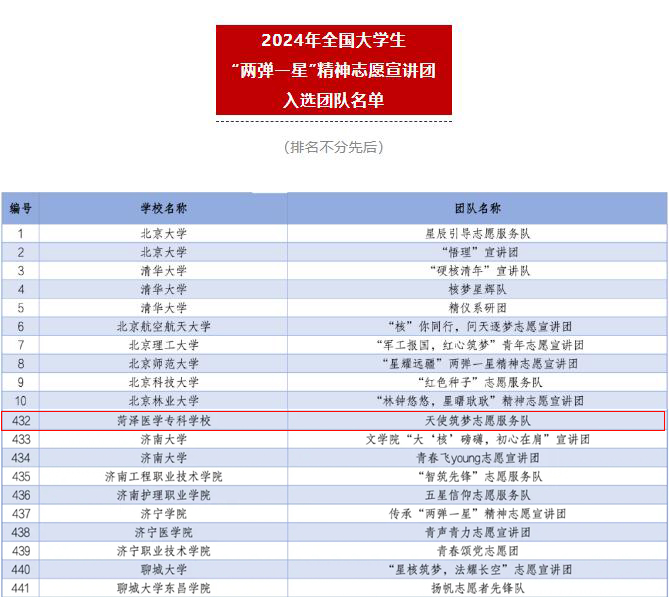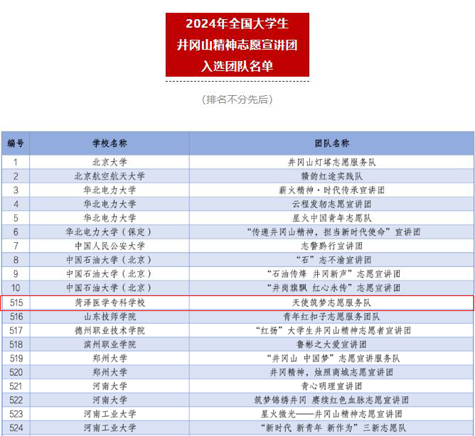 为深入学习宣传贯彻习近平新时代中国特色社会主义思想和党的二十大精神,落实“强国复兴有我”群众性主题宣传教育活动相关要求,团中央青年志愿者行动指导中心分别联合全国青少年井冈山革命传统教育基地管理中心、中国核工业集团有限公司、国家电力投资集团有限公司、共青团陕西省委、中共延安市委,组织开展了2024年全国大学生井冈山精神、“两弹一星”精神、延安精神志愿宣讲团的遴选工作。我校护理系天使筑梦志愿服务队精心准备申报材料,从全国数千支团队中脱颖而出,成功入选三类专项宣讲活动。