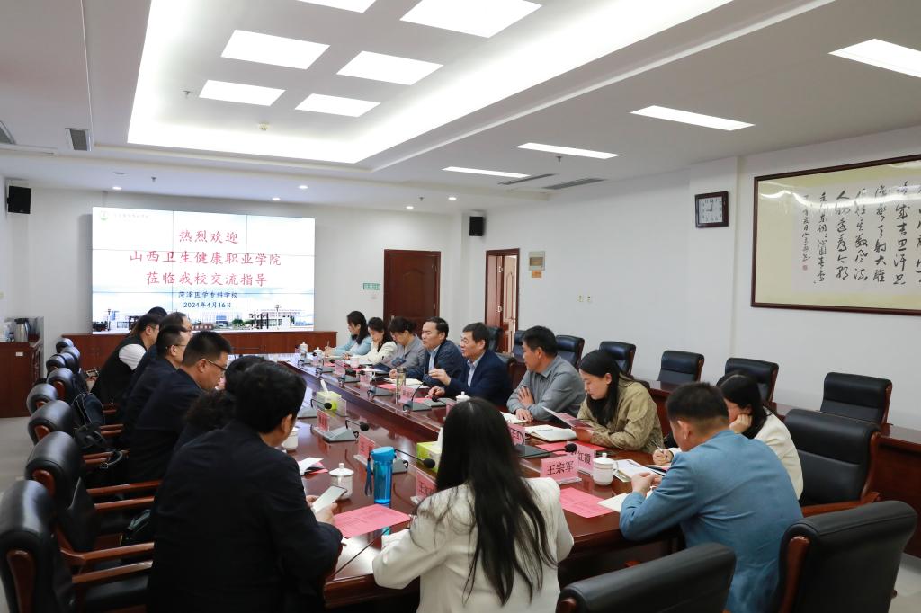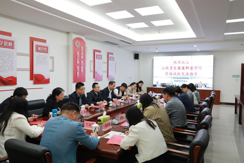 4月16日,山西卫生健康职业学院党委副书记、院长王轩、山西卫生健康职业学院党委副书记赵建君等一行9人到到我校调研座谈交流。校党委副书记蒋继国和相关部门负责人等同志参加了座谈。会议由蒋继国同志主持。