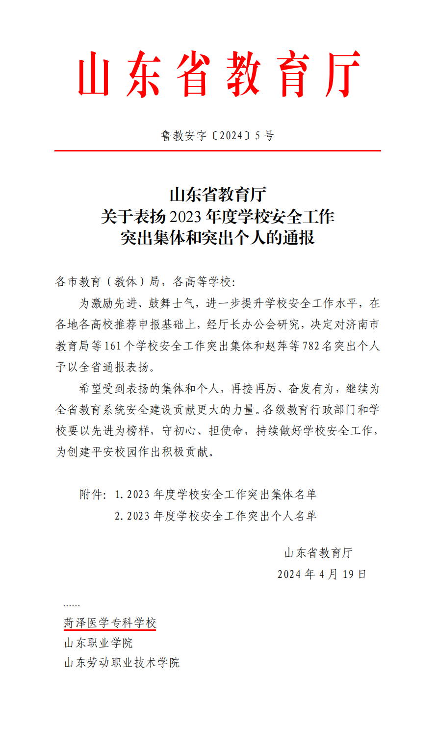 近日,山东省教育厅发布《关于表扬2023年度学校安全工作突出集体和突出个人的通报》(鲁教安字〔2024〕5号),我校获评2023年度山东省学校安全工作突出集体。