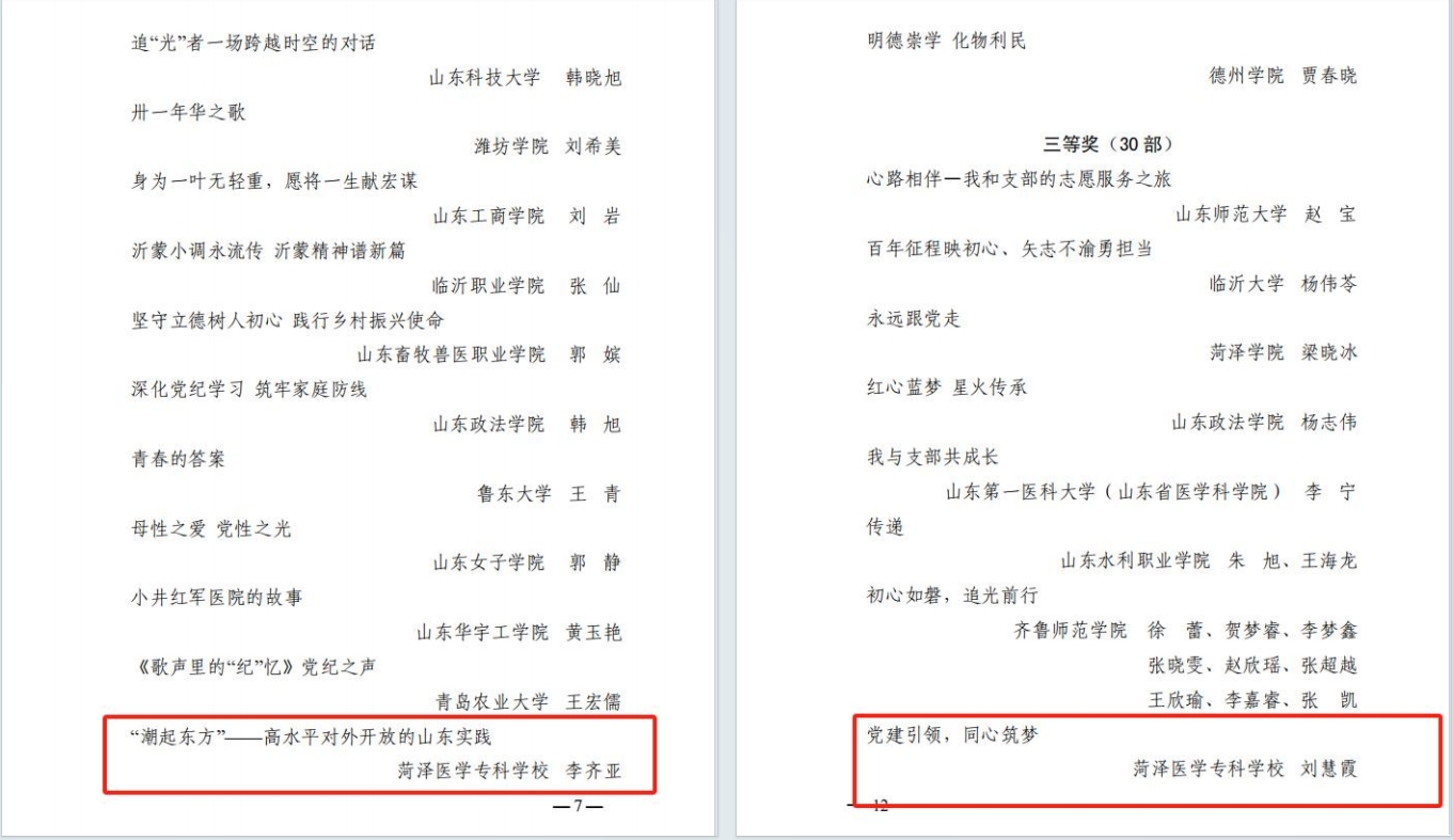 近日,山东省委教育工委公布了2024年度全省高校“我来讲党课”“我和我的支部”获奖名单。我校思政部(马克思主义学院)第一党支部书记李齐亚主讲的《潮起东方—高水平对外开放的山东实践》获评“我来讲党课”作品三等奖,基础医学部第一党支部书记刘慧霞主讲的《党建引领同心筑梦》获评“我和我的支部”作品三等奖。