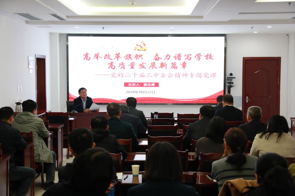 袁志勇以《高举改革旗帜奋力谱写学校高质量发展新篇章》为题,重点围绕“学习好全会精神,增强全面深化改革的思想自觉;贯彻好全会精神,践行推进学校改革的使命担当;落实好全会精神,凝聚高质量发展的行动力量”三个方面展开讲解,重点阐述了全会召开的重要意义、进一步全面深化改革的主要内容、中心议题、指导思想、目标任务、重大原则、价值追求、根本保证,并围绕教育、科技、人才三位一体综合改革,结合学校实际,提出推进学校全面改革需要把握的一些重大问题和重要举措,对深入贯彻落实党的二十届三中全会精神、加快推进学校高质量发展进行了动员和部署。他强调,深入学习三中全会精神,要认真贯彻《决定》提出的改革举措,坚持以师生为中心的理念、坚持问题导向,围绕落实立德树人根本任务、加快推进学校高质量发展、全面提高人才培养质量,结合学校实际和重点工作,深入推进学校全面改革。