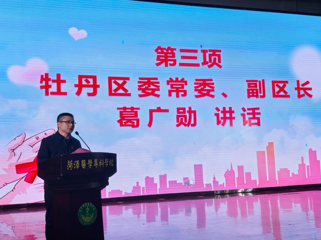 市政协副主席赵胜利,校党委委员、副校长齐云飞,市科学技术协会副主席周保华,市妇联权益部部长谷新勇,牡丹区区委常委、副区长葛广勋,牡丹区卫健局党组书记、局长王磊,市卫健委疾控科副科长王海峰,市传染病医院副院长张纪东,牡丹区卫健局疾控科科长李彬,牡丹区疾控中心副主任李保华,市性病艾滋病防治协会会长霍炜等同志和我校学工处、团委,各系部团总支书记、专兼职辅导员、学生代表共计500余人出席活动,校团委书记于淼主持活动。