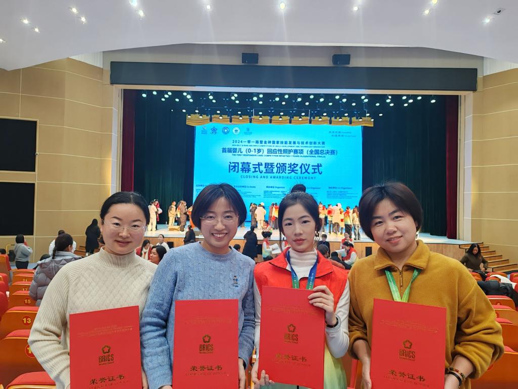 11月29日至12月1日,2024一带一路暨金砖国家技能发展与技术创新大赛首届婴儿(0-1岁)回应性照护赛项全国总决赛在兴安举行,自全国各地26个省、自治区148所院校的304名参赛选手参赛,赛项分中职组、高校组、教师组三个竞赛组别,我校选手在此次大赛中表现优异,韩茹钰荣获高校组二等奖,指导教师赵淑敏获得优秀指导教师奖,高洁、宋青分别获得教师组三等奖、优秀奖,我校获优秀组织奖。