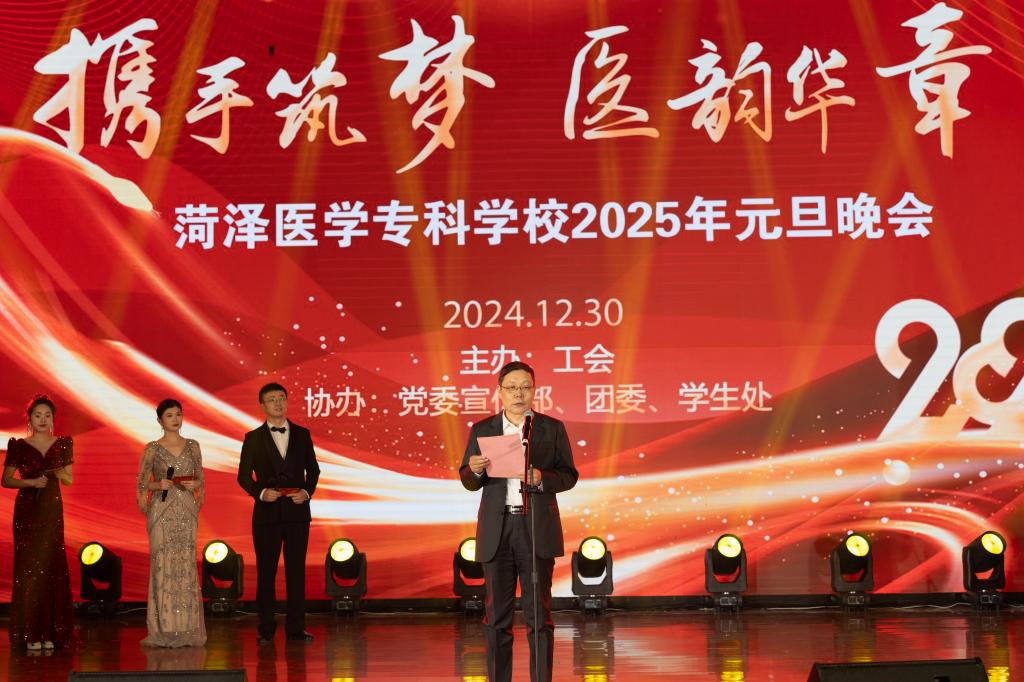 12月30日晚,由工会主办,党委宣传部、校团委和学工处协办的“携手筑梦 医韵华章”2025年元旦联欢晚会在学术报告厅举行。学校党委领导、二级部门负责人、教职工和学生共500余人欢聚一堂,喜迎元旦佳节。学校党委副书记、校长顾润国致新年贺词,向全体师生表示诚挚问候和美好祝愿。